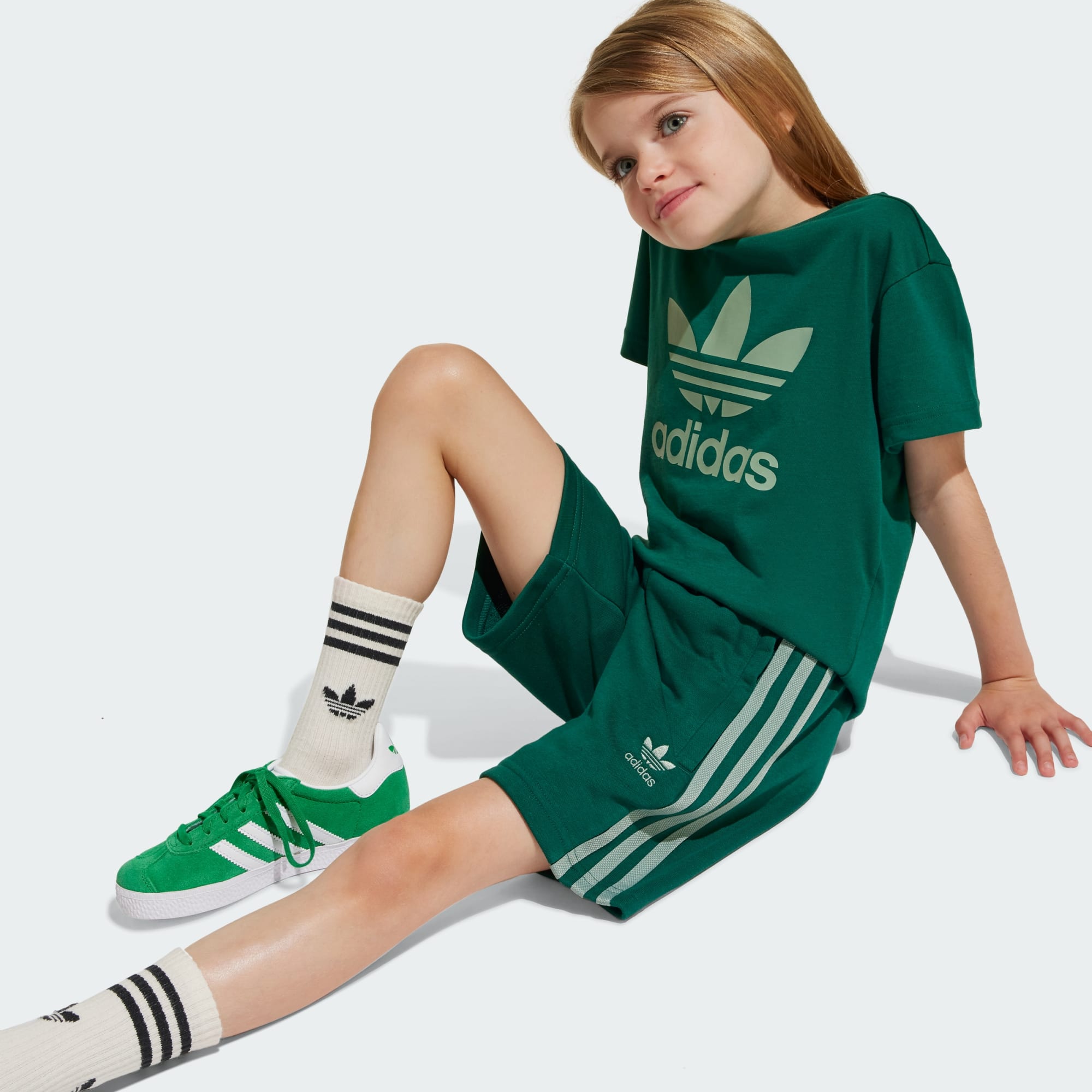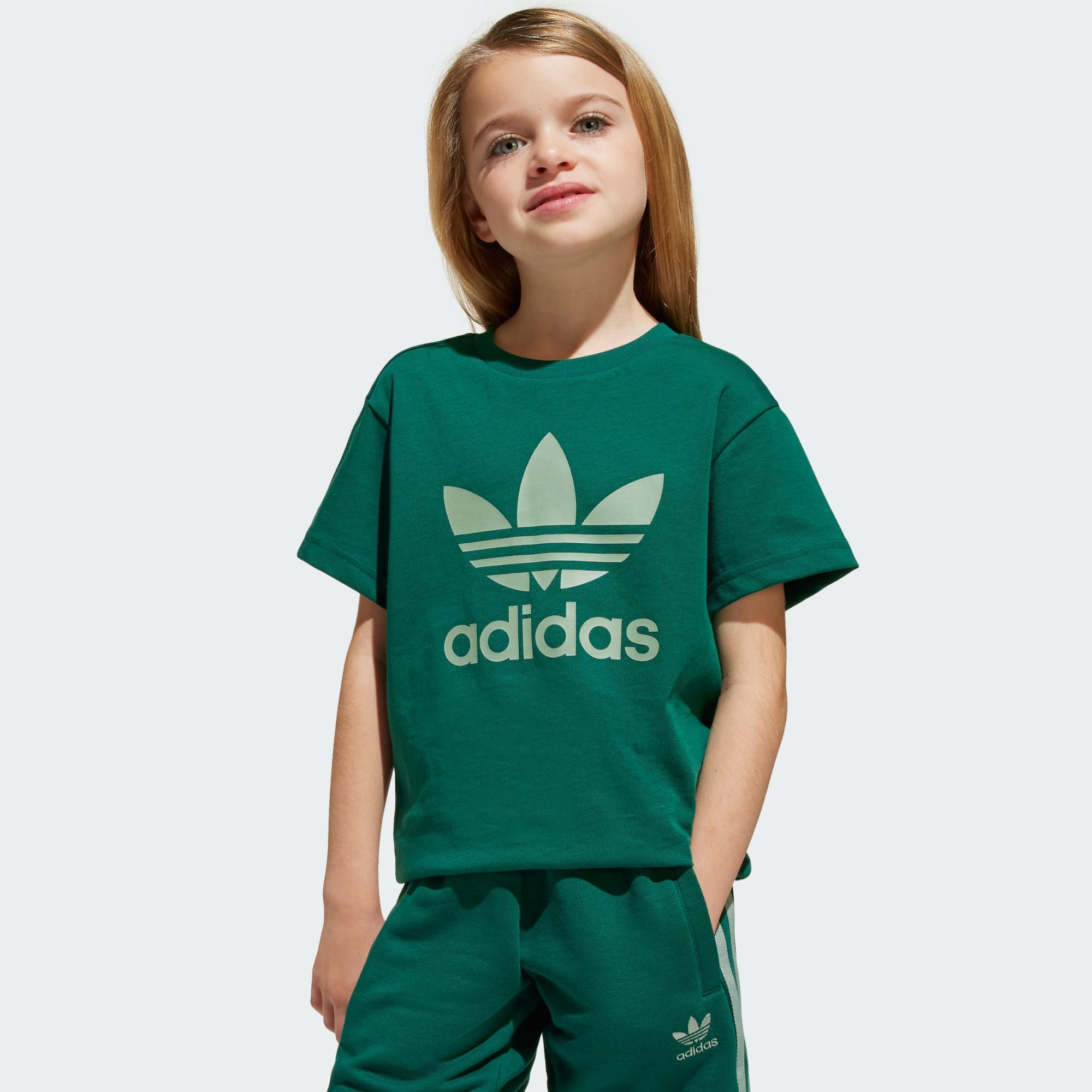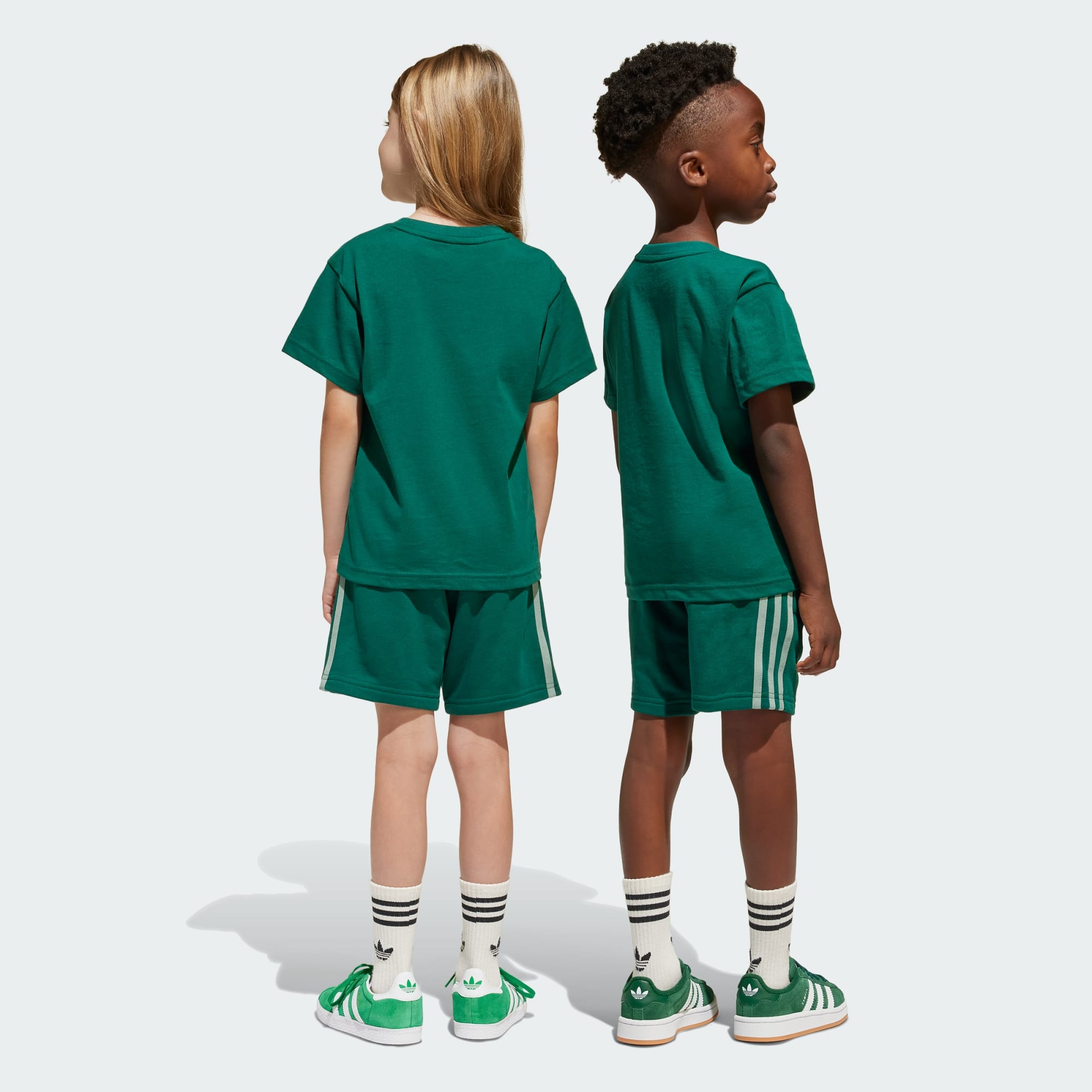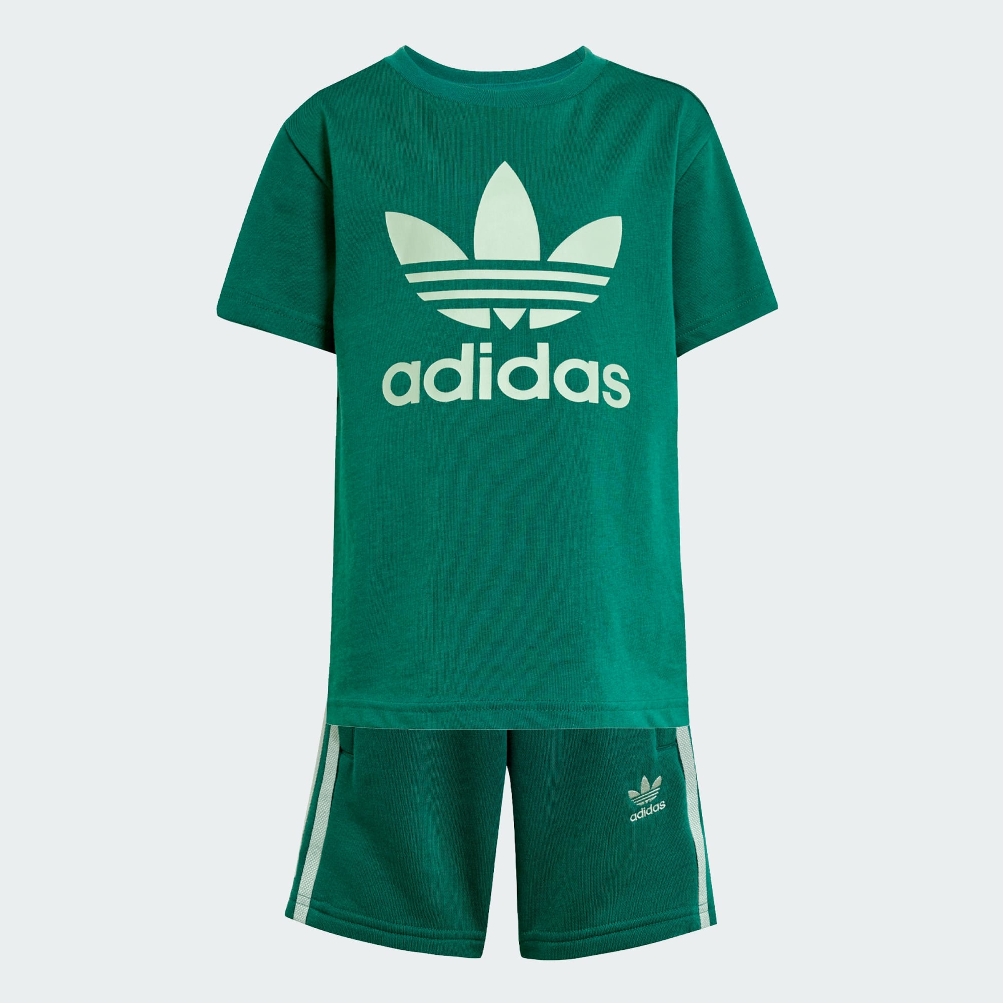 This kids' adidas shorts and tee set features a soft cotton single jersey build and a drawcord elastic waist for all-day comfort. From the oversized Trefoil on the chest to the 3-Stripes running down the legs its rooted in sport and style. Destined to become a go-to warm-weather outfit, this casual set is an everyday all-in-one outfit that's ready when they are.
