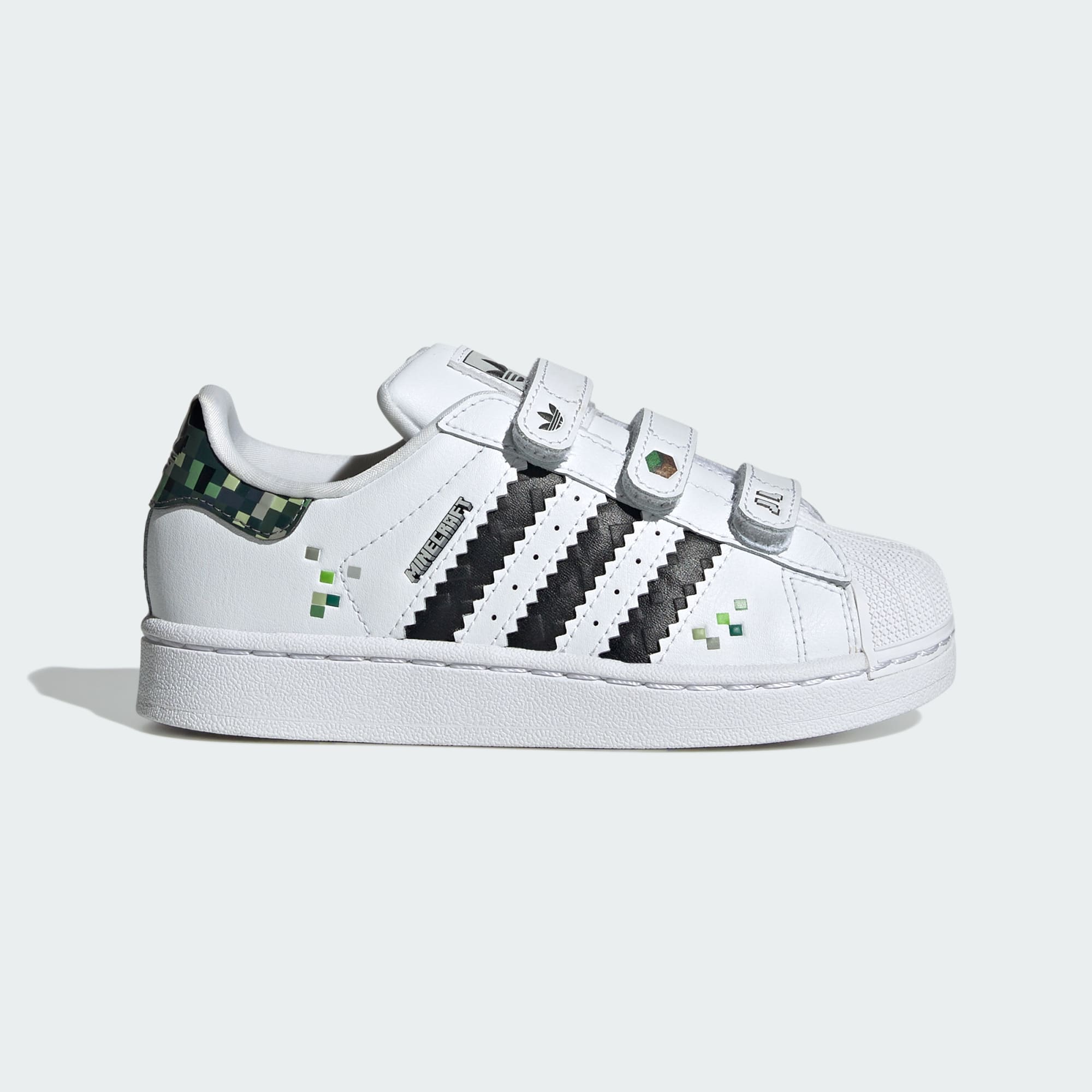 These kids' adidas Superstar shoes add graphics inspired by the blocky world of Minecraft to the iconic basketball trainer. The shell toe and serrated 3-Stripes keep the look classic while a padded tongue, moulded sockliner and synthetic upper provide comfort. The rubber outsole has the durability and traction for any terrain.