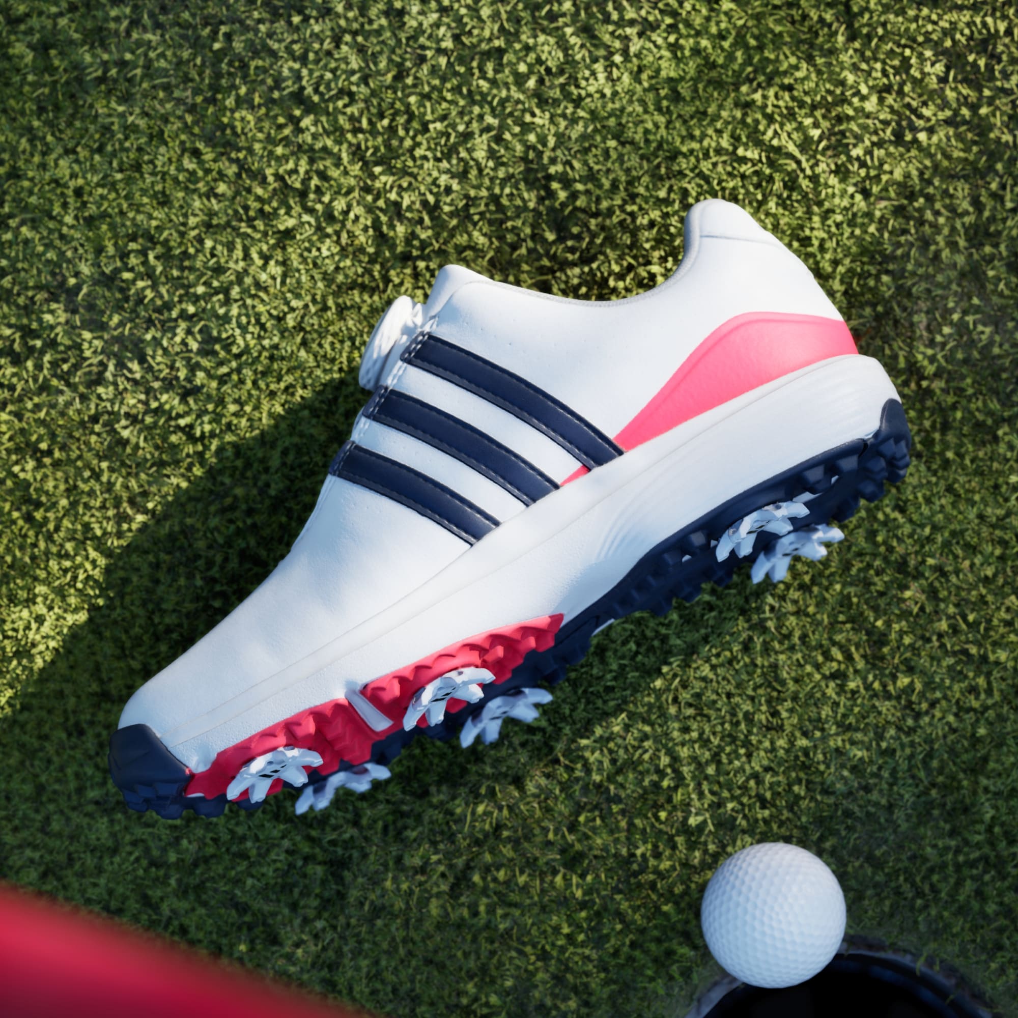 Sepatu golf yang siap untuk berkompetisi, sebagian dibuat dari material daur ulang yang terbarukan.