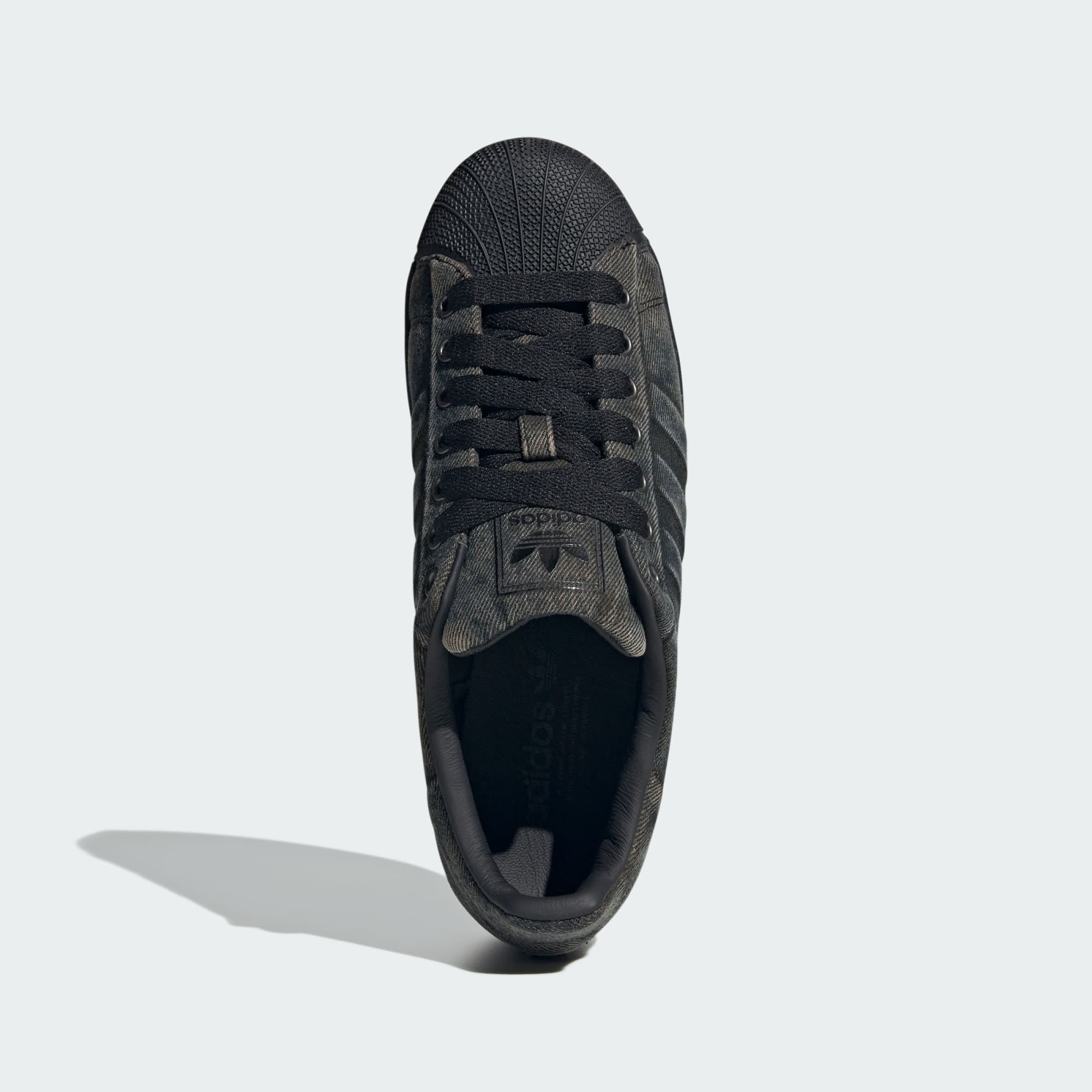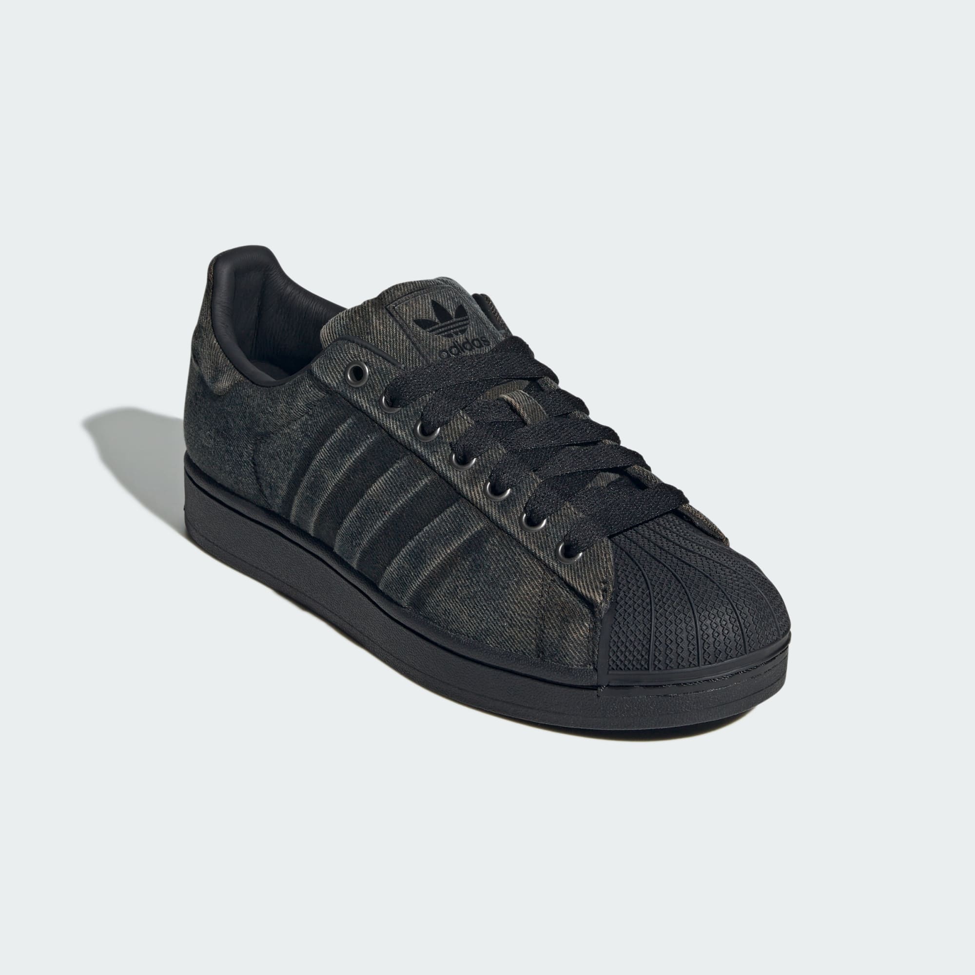 Sepatu Superstar berbahan denim yang sudah dicuci, yang mengutamakan kesan halus.