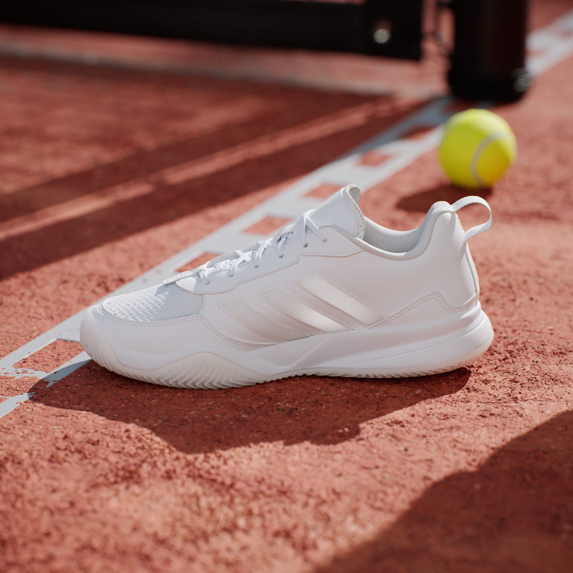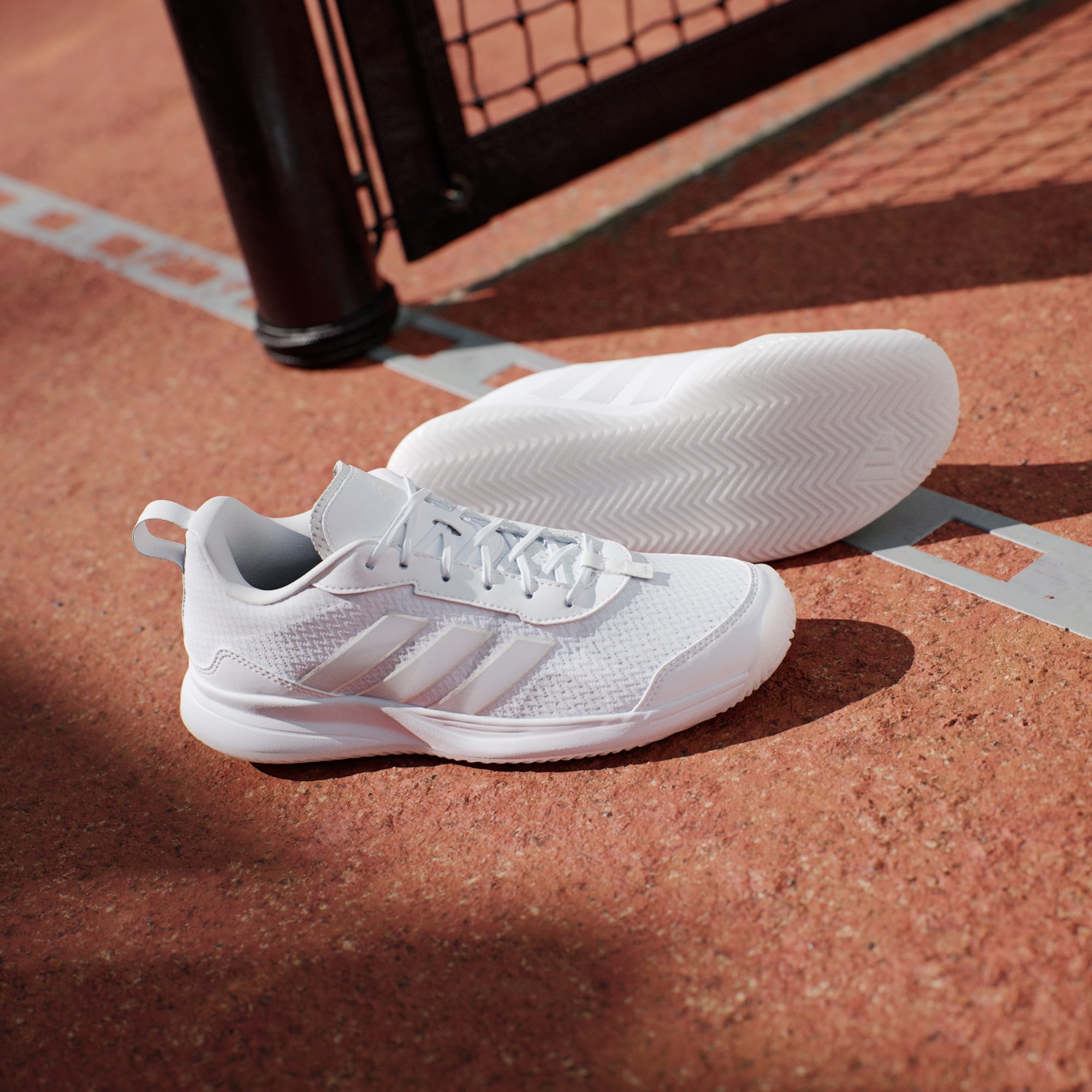 Sepatu tenis dengan zona abrasi Adituff untuk mendukung gerak kaki yang lincah di lapangan.